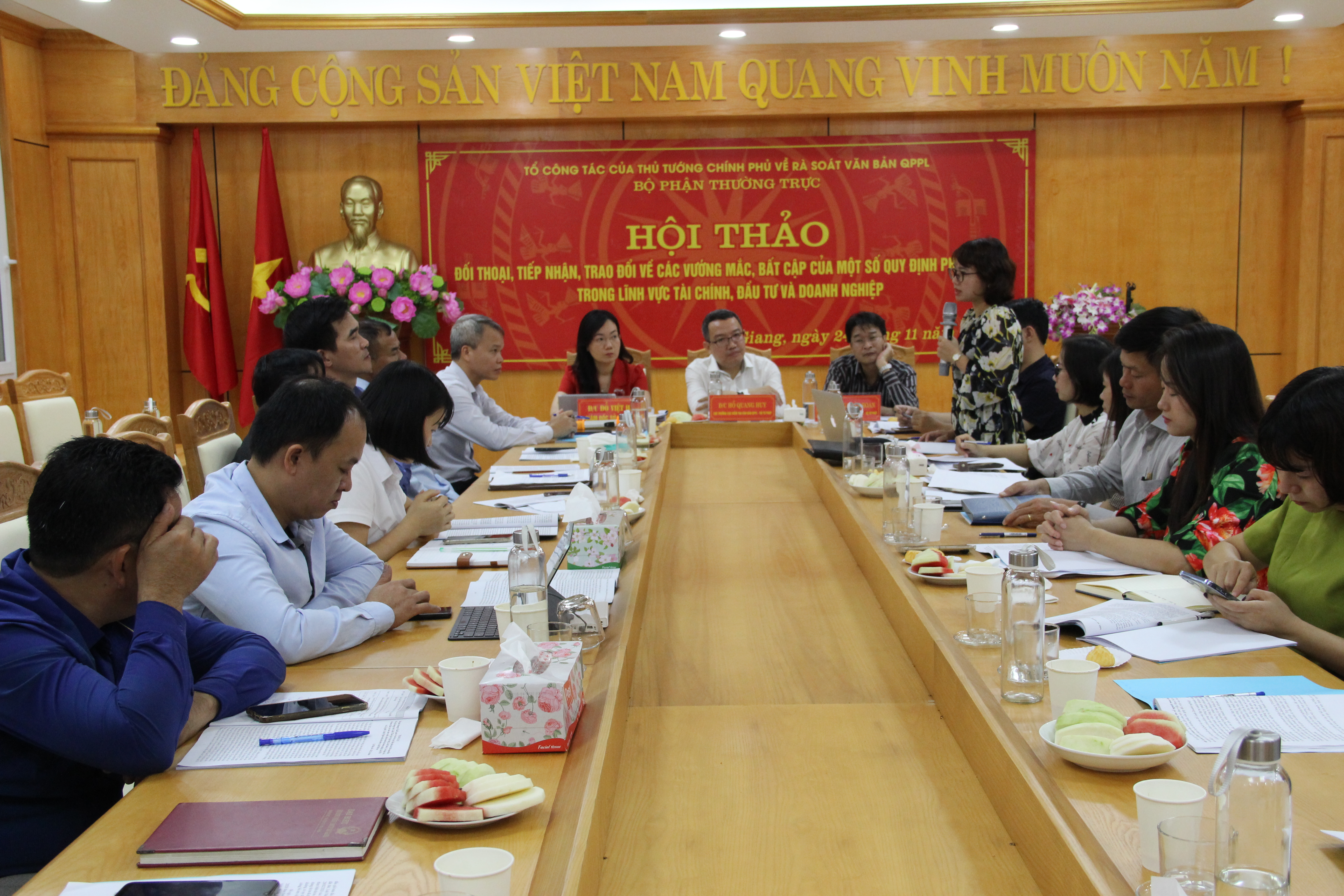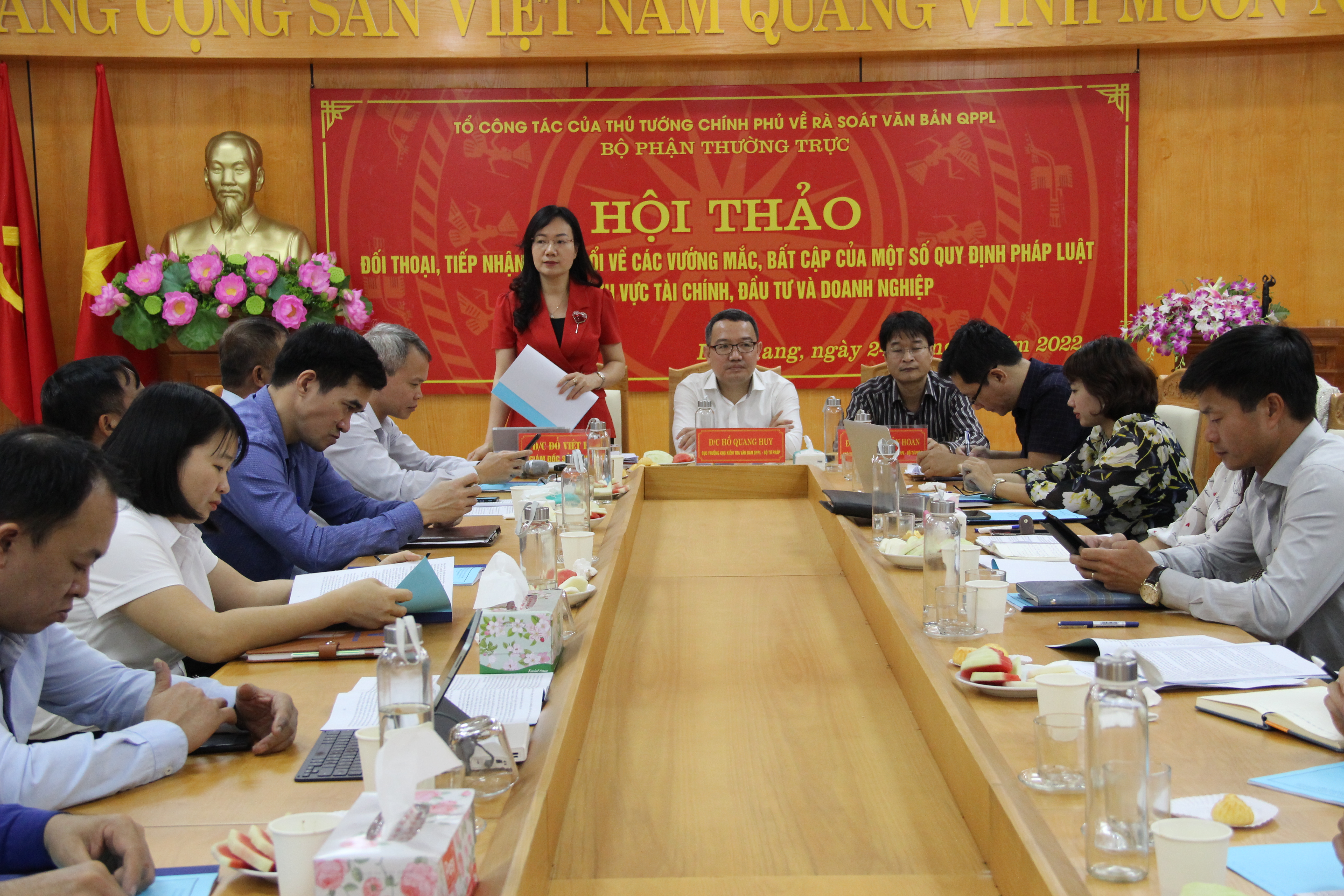 Tại Hội thảo, các chuyên gia trong công tác rà soát văn bản QPPL, chuyên gia trong lĩnh vực pháp luật về tài chính, đầu tư và doanh nghiệp của Vụ Pháp chế, Bộ Tài chính; Vụ Pháp chế, Bộ Kế hoạch và Đầu tư đã thông tin tình hình triển khai và kết quả rà soát đối với các vấn đề bất cập, không phù hợp với thực tiễn của các quy định pháp luật có liên quan đến một số luật như Luật Thuế giá trị gia tăng; Luật Quản lý, sử dụng vốn nhà nước đầu tư vào sản xuất, kinh doanh tại doanh nghiệp; Luật Phí và lệ phí; Luật Ngân sách nhà nước; Luật Điện lực; Luật Hợp tác xã; Luật Đấu thầu; Luật Đầu tư theo phương thức đối tác công tư (PPP); Luật Doanh nghiệp; Luật Quy hoạch...