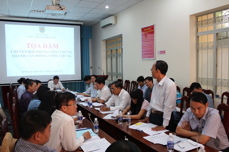 Chiều ngày 27/11/2015, tại TP. Hồ Chí Minh, Cục Công tác phía Nam – Bộ Tư pháp đã tổ chức Toạ đàm “chuyển đổi Phòng công chứng thành Văn phòng công chứng”. Tham dự Toạ đàm có đại diện của 09 Sở Tư pháp khu vực phía Nam, trên 20 tổ chức hành nghề công chứng, Hội Công chứng viên của TP. Hồ Chí Minh, Cần Thơ, Bà Rịa - Vũng Tàu, Lâm Đồng. Toạ đàm do ông Nguyễn Thanh Bình - Phó Cục trưởng phụ trách Cục Công tác phía Nam chủ trì.