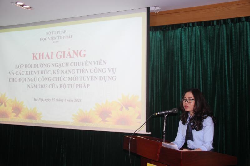Thực hiện Kế hoạch đào tạo, bồi dưỡng công chức, viên chức Bộ Tư pháp năm 2023, Học viện Tư pháp và Vụ Tổ chức cán bộ phối hợp tổ chức Lớp bồi dưỡng ngạch chuyên viên và các kiến thức, kỹ năng tiền công vụ cho đội ngũ công chức mới tuyển dụng năm 2023 của Bộ Tư pháp. Sáng ngày 15/6/2023, Học viện Tư pháp tổ chức khai giảng lớp học.