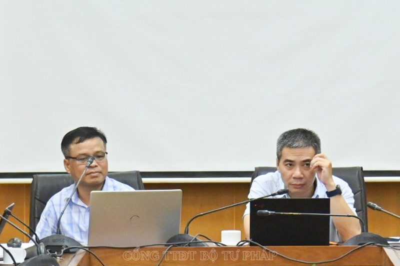 Đồng chí Nhâm Ngọc Hiển (bên phải), Phó cục trưởng Cục Hộ tịch, quốc tịch, chứng thực giải đáp các câu hỏi của địa phương.