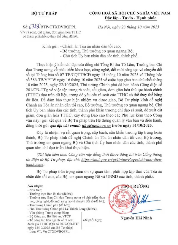 Ngày 23/10/2025, Bộ trưởng Bộ Tư pháp Nguyễn Hải Ninh đã có Công văn số 6723/BTP-CTXDVBQPPL về việc rà soát, cắt giảm, đơn giản hóa TTHC có thành phần hồ sơ thay thế bằng dữ liệu