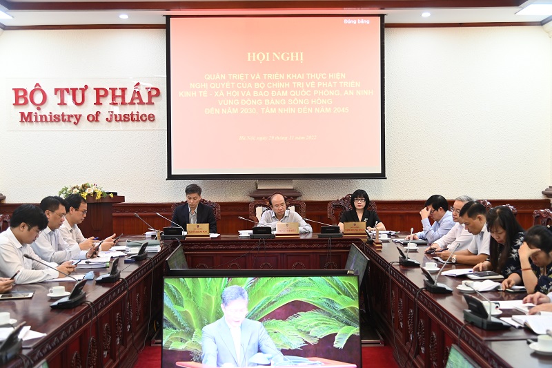 Sáng 29/11, Bộ Chính trị tổ chức Hội nghị trực tiếp kết hợp trực tuyến quán triệt và triển khai thực hiện Nghị quyết số 30-NQ/TW của Bộ Chính trị về phát triển kinh tế - xã hội và bảo đảm quốc phòng, an ninh vùng đồng bằng sông Hồng đến năm 2030, tầm nhìn đến năm 2045. Tổng Bí thư Nguyễn Phú Trọng, Chủ tịch nước Nguyễn Xuân Phúc, Thủ tướng Chính phủ Phạm Minh Chính, Thường trực Ban Bí thư Võ Văn Thưởng đồng chủ trì Hội nghị. Tham dự Hội nghị có các đồng Uỷ viên Bộ Chính trị, Bí thư Trung ương Đảng, Ủy viên Trung ương Đảng; lãnh đạo các ban, bộ ngành Trung ương, địa phương, cơ quan, đơn vị…Lãnh đạo Bộ Tư pháp dự Hội nghị tại điểm cầu Bộ Tư pháp.