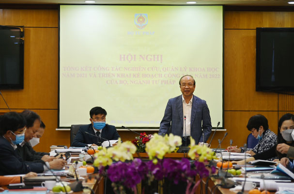 Báo cáo tại Hội nghị cho biết: với sự quan tâm chỉ đạo sát sao của Ban Cán sự, Lãnh đạo Bộ, sự nỗ lực vượt khó của các đơn vị nghiên cứu khoa học, các Ban chủ nhiệm nhiệm vụ, sự phối hợp khá hiệu quả của các đơn vị trong và ngoài Bộ và sự chung tay của các chuyên gia, nhà khoa học, nhà hoạt động thực tiễn, mặc dù chịu tác động không nhỏ của đại dịch Covid-19, hầu hết các nhiệm vụ nghiên cứu khoa học và quản lý khoa học quan trọng của Bộ giao đều được hoàn thành với khối lượng và chất lượng tốt. Nhiều nhiệm vụ được hoàn thành một cách xuất sắc, trong đó việc tổ chức hội thảo cấp quốc gia do Bộ Tư pháp chủ trì thực sự để lại những dấu ấn tốt trong giới chuyên môn về sự công phu, sức hấp dẫn về nội dung và tính lan tỏa trong xã hội được Lãnh đạo Đảng và Nhà nước đánh giá cao. Hoạt động khoa học của Bộ, Ngành Tư pháp tiếp tục có nhiều khởi sắc. Với việc hoàn thành 23 nhiệm vụ khoa học của năm 2021, đây thực sự là kho dữ liệu rất có giá trị về mặt lý luận và thông tin thực tiễn, chuyên sâu phục vụ công tác tham mưu xây dựng đường lối, chủ trương của Đảng, hoạch định chính sách, xây dựng pháp luật của đất nước nói chung và công tác quản lý ngành Tư pháp nói riêng.