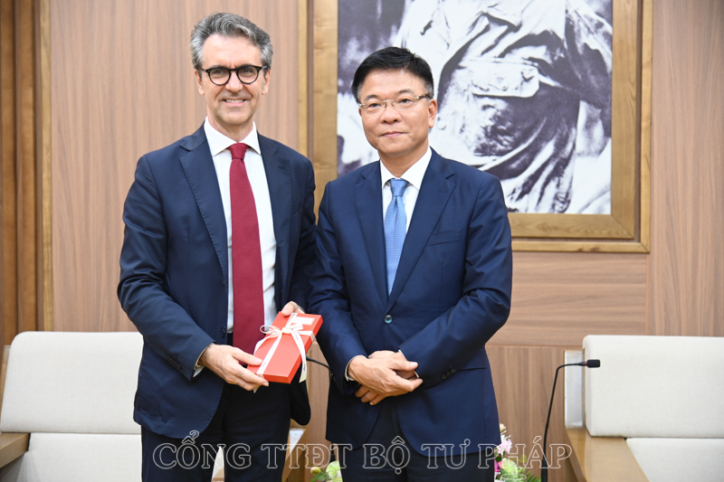 Tại buổi tiếp, Bộ trưởng Lê Thành Long cũng đã chia sẻ với Đại sứ Pier Giorgio Aliberti về Nghị quyết số 27-NQ/TW ngày 09/11/2022 của Ban Chấp hành Trung ương về tiếp tục xây dựng và hoàn thiện Nhà nước pháp quyền xã hội chủ nghĩa Việt Nam trong giai đoạn mới. Trên cơ sở đó, Bộ Tư pháp đã ban hành Quyết định số 764/QĐ-BTP ngày 22/5/2023 ban hành Chương trình hành động của Bộ Tư pháp thực hiện Nghị quyết số 27-NQ/TW. Chương trình hành động đã đề ra 08 nhóm nhiệm vụ trọng tâm bám sát vào các định hướng được xác định trong Nghị quyết số 27-NQ/TW cũng như các nhóm nhiệm vụ trọng tâm của Nghị quyết số 77/NQ-CP của Chính phủ trong việc tiếp tục tiếp tục hoàn thiện hệ thống pháp luật và cơ chế tổ chức thực hiện pháp luật nghiêm minh, hiệu quả, bảo đảm yêu cầu phát triển đất nước nhanh và bền vững. Trong quá trình xây dựng, hoàn thiện pháp luật, cải cách pháp luật và cải cách tư pháp, bên cạnh việc phát huy nội lực, Bộ Tư pháp cũng như các cơ quan pháp luật và tư pháp của Việt Nam mong muốn sẽ tiếp tục nhận được sự chia sẻ kinh nghiệm và sự hợp tác, hỗ trợ của EU, vì lợi ích thiết thực của cả hai Bên.