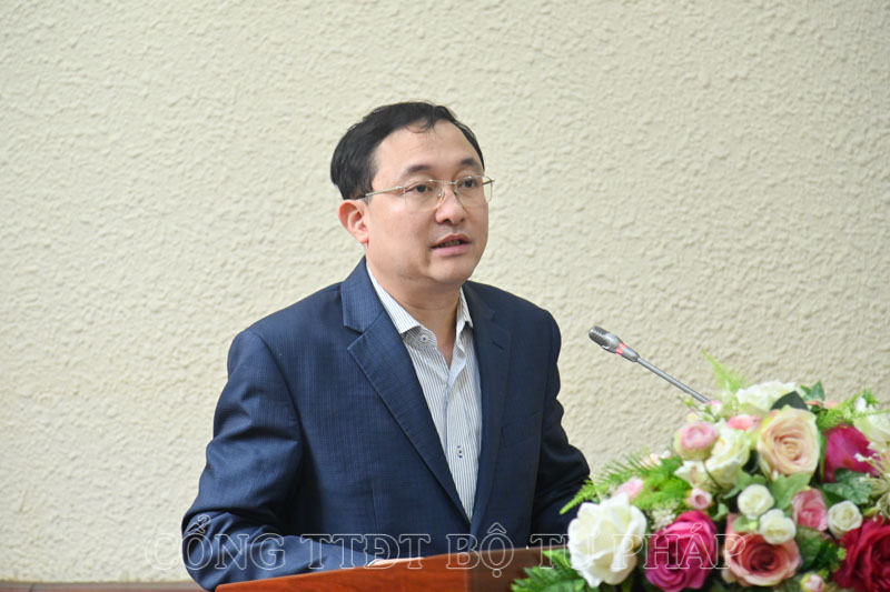 Phó Cục trưởng Cục PBGDPL Phan Hồng Nguyên báo cáo tại Hội nghị