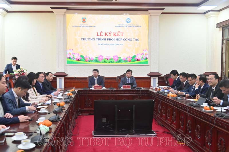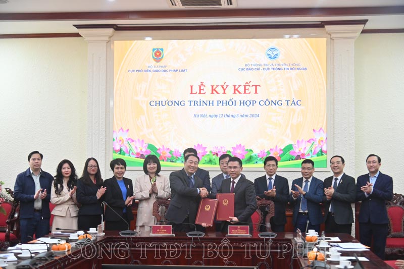 Ngày 12/3, tại trụ sở Bộ Tư pháp đã diễn ra Lễ ký kết Chương trình phối hợp công tác giữa Cục Phổ biến, giáo dục pháp luật (Bộ Tư pháp) và Cục Báo chí, Cục Thông tin đối ngoại (Bộ Thông tin và Truyền thông). Việc ký kết sẽ đánh dấu bước phát triển mới trong công tác phối hợp giữa các đơn vị nhằm thực hiện có hiệu quả chức năng, nhiệm vụ của từng đơn vị cũng như của hai Bộ, ngành.