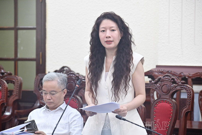 Phó Chánh Văn phòng Bộ Tư pháp Lê Thu Anh báo cáo tại cuộc họp.