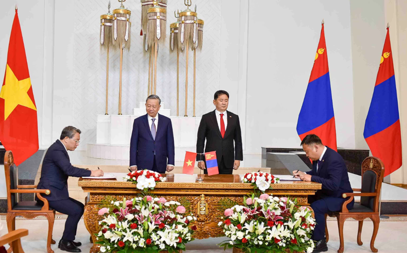 Trong khuôn khổ chuyến thăm cấp Nhà nước tới Mông Cổ, chiều 30/9, ngay sau hội đàm, Tổng Bí thư, Chủ tịch nước Tô Lâm và Tổng thống Mông Cổ Ukhnaagiin Khurelsukh cùng chứng kiến Lễ ký các văn kiện hợp tác giữa các bộ, ngành, cơ quan hai nước Việt Nam-Mông Cổ.
