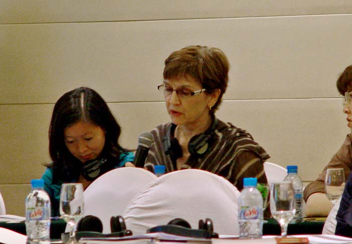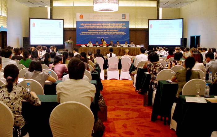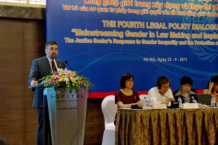 Bên cạnh đó, Bà Amarsanaa Darisuren – Chuyên gia về nhân quyền Cơ quan Phụ nữ Liên hợp quốc khu vực Đông và Đông Nam Á trong bài tham luận về: “Đảm bảo hệ thống tư pháp phục vụ phụ nữ – kinh nghiệm so sánh và đề xuất đối với Việt Nam” cho biết: 2/3 quốc gia trên thế giới có luật về bạo lực gia đình, ở khu vực Đông Nam Á có 8 nước đã thông qua luật Bình đẳng giới. Các nước đã đưa ra những quy định pháp luật về vai trò của các cơ quan quyền lực nhà nước về bình đẳng giới và các cơ chế thực thi pháp luật. Đó là những bước tiến mạnh mẽ trong 10 năm trở lại đây về bạo lực gia đình và bảo vệ quyền cho người phụ nữ. Ở Việt Nam chỉ có khoảng 29% tỉ lệ nữ giới tham gia vào cơ quan quyền lực nhà nước và bà cho rằng cần thiết phải tăng cường sự có mặt của nữ giới trong cả bộ máy Tư pháp và Hành pháp, điều đó sẽ tạo ra sự thay đổi và chuyển biến trong vấn đề bảo vệ người phụ nữ. Để bảo vệ cho người phụ nữ thì ban hành pháp luật là chưa đủ mà cần phải có các thiết chế khác, cách thực thi, các biện pháp giúp phụ nữ tiếp cận với công lý.