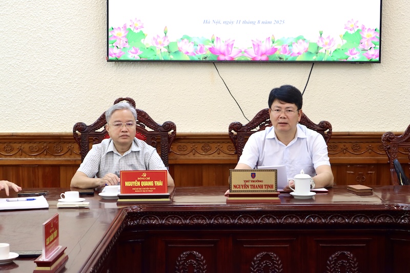 Đồng chí Nguyễn Thanh Tịnh, Phó Bí thư thường trực Đảng uỷ Bộ, Thứ trưởng Bộ Tư pháp và đồng chí Nguyễn Quang Thái, Phó Bí thư chuyên trách Đảng uỷ Bộ chủ trì buổi làm việc.