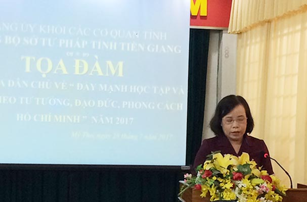 Vừa qua, Đảng ủy, Ban Giám đốc Sở Tư pháp tỉnh Tiền Giang đã tổ chức Tọa đàm kết hợp thi “Hái hoa dân chủ về đẩy mạnh học tập và làm theo tư tưởng, đạo đức, phong cách Hồ Chí Minh” năm 2017. Tham dự buổi Tọa đàm có đồng chí Võ Văn Dũng, Ủy viên Ban Thường vụ, Trưởng ban Tuyên giáo Đảng ủy khối các cơ quan tỉnh Tiền Giang, các đồng chí trong Ban Chấp hành Đảng bộ Sở Tư pháp cùng tất cả các đảng viên, công chức, viên chức và người lao động của 06 chi bộ trực thuộc Đảng bộ Sở Tư pháp. Đồng chí Nguyễn Thị Đang, Tỉnh ủy viên, Bí thư Đảng ủy, Giám đốc Sở Tư pháp dự và chỉ đạo buổi Tọa đàm.