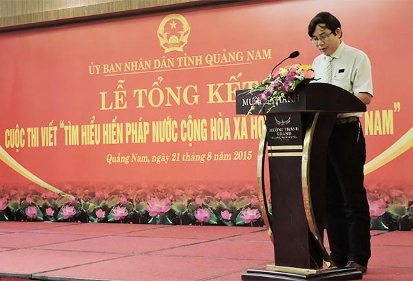 Sáng ngày 21/8/2015, tại Hội trường Khách sạn Mường Thanh Grand Quảng Nam, Ban Tổ chức cuộc thi viết “Tìm hiểu Hiến pháp nước CHXHCN Việt Nam” tỉnh tổ chức Lễ Tổng kết và trao giải Cuộc thi trên địa bàn tỉnh. Đến dự Lễ Tổng kết có đồng chí Lê Văn Thanh, Phó Chủ tịch UBND tỉnh.