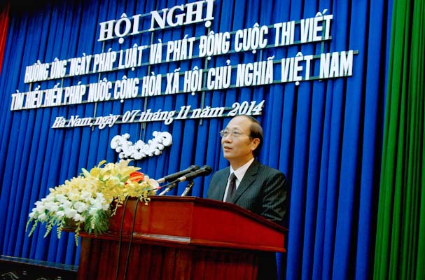 Thực hiện Công văn số 3642/BTP-PBGDPL ngày 25 tháng 8 năm 2014 của Bộ Tư pháp về việc tổ chức Ngày Pháp luật nước CHXHCNVN; Quyết định số 2157/QĐ-BTP ngày 22/9/2014 của Bộ Trưởng Bộ Tư pháp ban hành Kế hoạch tổ chức cuộc thi viết ‘Tìm hiểu Hiến pháp nước Cộng hòa XHCN Việt Nam", ngày 07/11/2014 tại Hà Nam, Ủy ban nhân dân tỉnh tổ chức hội nghị hưởng ứng Ngày Pháp luật năm 2014 và phát động thi viết “Tìm hiểu Hiến pháp nước Cộng hòa xã hội chủ nghĩa Việt Nam”.
