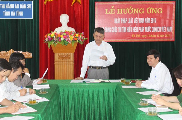 Hướng ứng "Ngày pháp luật nước Cộng hòa xã hội chủ nghĩa Việt Nam", Cục THADS tỉnh Hà Tĩnh đã tổ chức nhiều hoạt động cùng với triển khai công tác năm 2015 từ ngày10/10/2014; Với khẩu hiệu "Công chức ngành thi hành án dân sự Hà Tĩnh gương mẫu chấp hành và bảo vệ Hiến pháp, pháp luật", bằng những việc làm cụ thể: