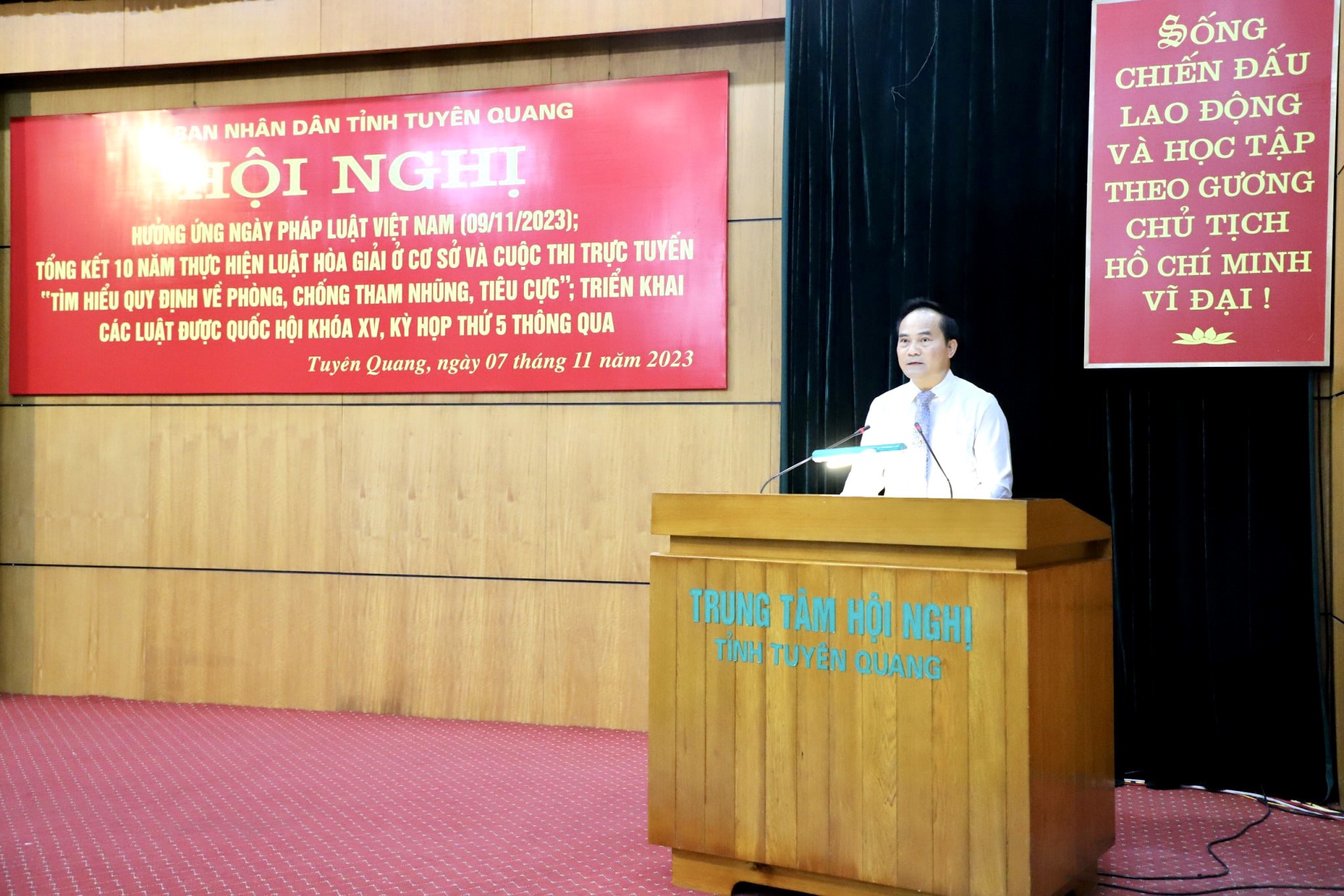 Ngày 07/11/2023, tại Trung tâm Hội nghị tỉnh, Ủy ban nhân dân tỉnh Tuyên Quang tổ chức Hội nghị hưởng ứng Ngày Pháp luật nước Cộng hòa xã hội chủ nghĩa Việt Nam; tổng kết 10 năm thực hiện Luật Hòa giải ở cơ sở và tổng kết, trao giải Cuộc thi trực tuyến “Tìm hiểu quy định về phòng, chống tham nhũng, tiêu cực”; phổ biến, quán triệt các Luật được Quốc hội khóa XV, kỳ họp thứ 5 thông qua. Đồng chí Hoàng Việt Phương, Ủy viên Ban Chấp hành Đảng bộ tỉnh, Phó Chủ tịch UBND tỉnh, Chủ tịch Hội đồng phối hợp phổ biến, giáo dục pháp luật tỉnh chủ trì Hội nghị.