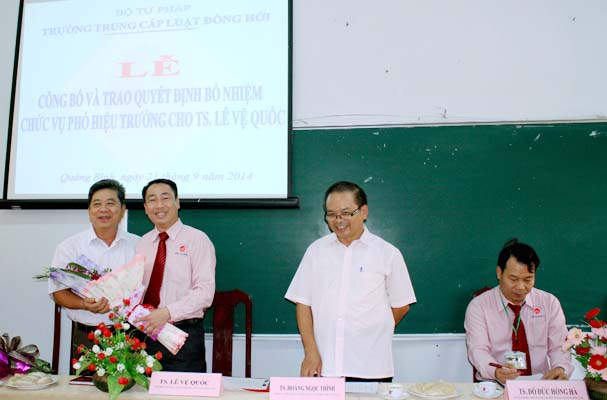 Thừa ủy quyền của Lãnh đạo Bộ công bố và trao Quyết định bổ nhiệm chức vụ Phó Hiệu trưởng cho TS. Lê Vệ Quốc, thầy Hoàng Ngọc Thỉnh bày tỏ sự vui mừng, kỳ vọng, tin tưởng TS. Lê Vệ Quốc sẽ phát huy tốt năng lực, trách nhiệm, gặt hái nhiều thành công, góp phần đưa Trường Trung cấp Luật Đồng Hới ngày càng phát triển.