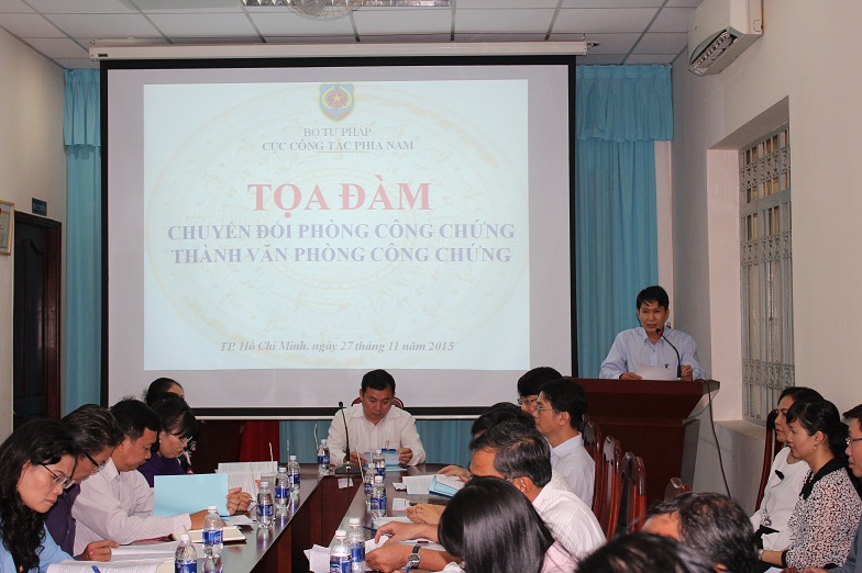 Chiều ngày 27/11/2015, tại TP. Hồ Chí Minh, Cục Công tác phía Nam – Bộ Tư pháp đã tổ chức Toạ đàm “chuyển đổi Phòng công chứng thành Văn phòng công chứng”. Tham dự Toạ đàm có đại diện của 09 Sở Tư pháp khu vực phía Nam, trên 20 tổ chức hành nghề công chứng, Hội Công chứng viên của TP. Hồ Chí Minh, Cần Thơ, Bà Rịa - Vũng Tàu, Lâm Đồng. Toạ đàm do ông Nguyễn Thanh Bình - Phó Cục trưởng phụ trách Cục Công tác phía Nam chủ trì.