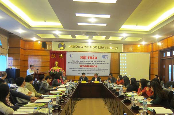 Tham dự Hội thảo có TS. Phan Chí Hiếu - Thứ trưởng Bộ Tư pháp, Hiệu trưởng Trường Đại học Luật Hà Nội; TS. Trần Quang Huy - Phó Hiệu trưởng; Ông Erwin Schweisshelm - Trưởng đại diện Viện FES tại Việt Nam; GS. Juergen Kessler - Trường Đại học Kỹ thuật và kinh tế Berlin, CHLB Đức; PGS.TS. Bùi Nguyên Khánh - Phó viện trưởng Viện Nhà nước và Pháp luật cùng các đại biểu đến từ Cục Quản lí cạnh tranh, Cục Quản lý thị trường - Bộ Công thương; Trường Đại học Thương mại; Trường Đại học Ngoại thương; Đại diện Tổ chức Thống nhất và tín thác bảo vệ NTD tại Hà Nội - Văn phòng CUTS Hà Nội và các giảng viên, sinh viên Trường Đại học Luật Hà Nội.