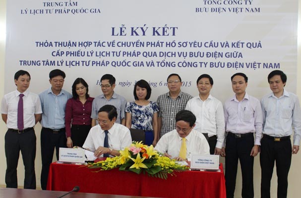 Ngày 30/6, Trung tâm Lý lịch tư pháp (LLTP) quốc gia và Tổng công ty Bưu điện Việt Nam tổ chức Lễ ký thỏa thuận hợp tác phối hợp thực hiện dịch vụ chuyển phát hồ sơ, kết quả cấp Phiếu LLTP và thỏa thuận này có hiệu lực ngay cùng ngày.