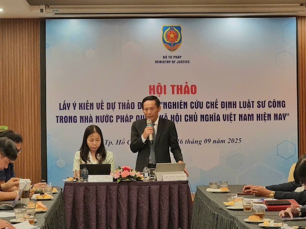 Ngày 26/9 tại TP Hồ Chí Minh, Bộ Tư pháp tổ chức Hội thảo “Lấy ý kiến về dự thảo Đề án “Nghiên cứu chế định luật sư công trong Nhà nước pháp quyền xã hội chủ nghĩa Việt Nam hiện nay”. Tham dự có đại diện của nhiều Bộ, ngành cũng như các địa phương, Liên đoàn Luật sư Việt Nam…
