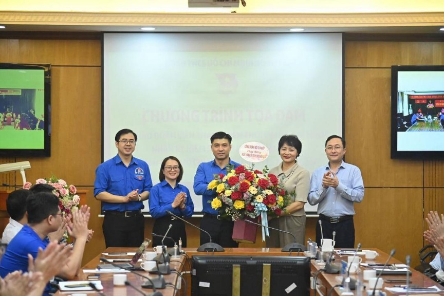 Chủ tịch Công đoàn Bộ Khương Thị Thanh Huyền và Phó chủ tịch Công đoàn Bộ Phan Hồng Nguyên tặng lẵng hoa chúc mừng thế hệ trẻ của Bộ nhân kỷ niệm 93 năm Ngày thành lập Đoàn TNCS Hồ Chí Minh.