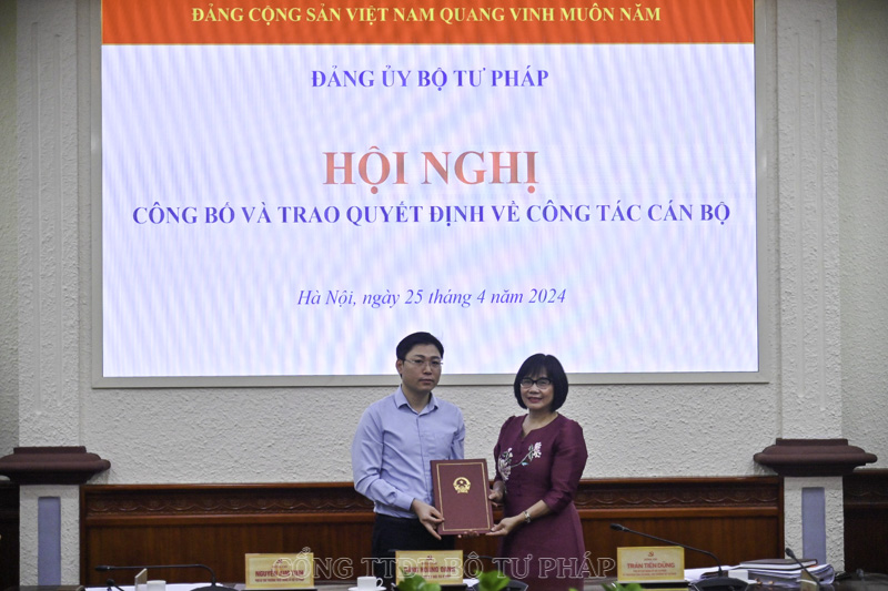 Đồng chí Đặng Hoàng Oanh, Bí thư Đảng ủy, Thứ trưởng Bộ Tư pháp trao Quyết định cho đồng chí Đỗ Xuân Quý, Bí thư Đảng ủy Văn phòng, Chánh Văn phòng Bộ kiêm Chánh Văn phòng Đảng - Đoàn thể.