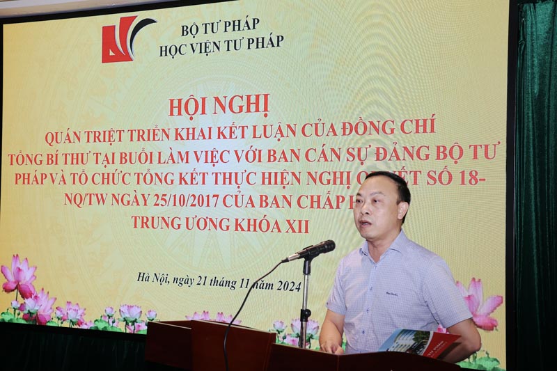 Chiều ngày 21/11/2024, đồng chí Nguyễn Xuân Thu - Bí thư Đảng ủy, Giám đốc Học viện Tư pháp chủ trì Hội nghị quán triệt Kết luận của đồng chí Tổng Bí thư Tô Lâm tại buổi làm việc với Ban cán sự đảng Bộ Tư pháp ngày 07/11/2024 và triển khai tổng kết thực hiện Nghị quyết số 18-NQ/TW ngày 25/10/2017 của BCH Trung ương khóa XII. Toàn thể viên chức, người lao động của Học viện Tư pháp dự Hội nghị.