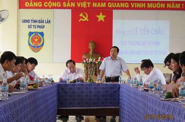 Chiều 07/10/2016, tại Sở Tư pháp Đắk Lắk, Đoàn công tác của Bộ Tư pháp do Ủy viên Ban Cán sự đảng, Thứ trưởng Bộ Tư Pháp Lê Tiến Châu làm Trưởng đoàn đã có buổi làm việc với Sở Tư pháp tỉnh Đắk Lắk. Tiếp và làm việc với Đoàn về phía Sở Tư pháp có đồng chí Nguyễn Minh Thuận - Tỉnh ủy viên, Giám đốc Sở Tư pháp cùng các đồng chí trong Ban Giám đốc Sở, Trưởng, Phó Trưởng phòng các phòng chuyên môn, Giám đốc, Phó Giám đốc các Trung tâm thuộc Sở.