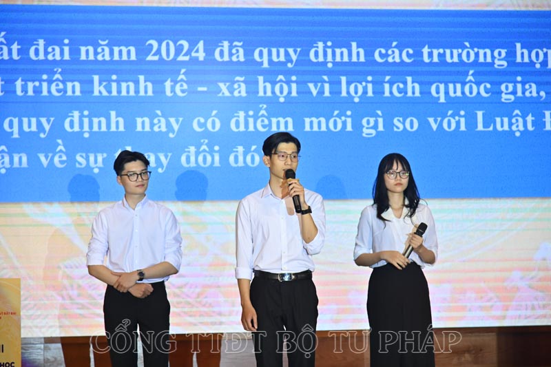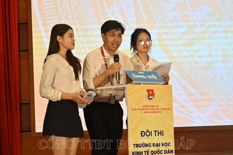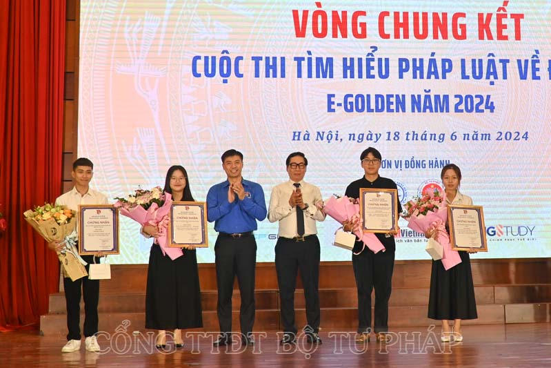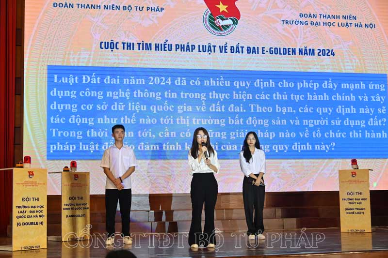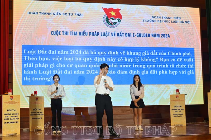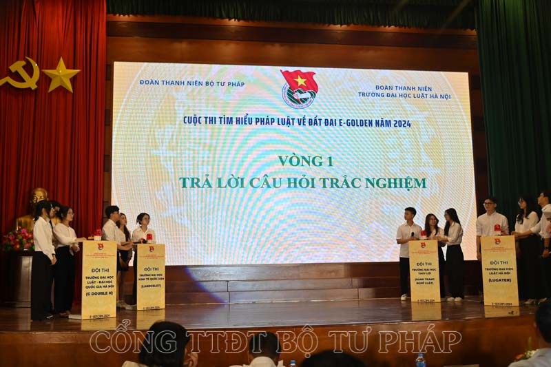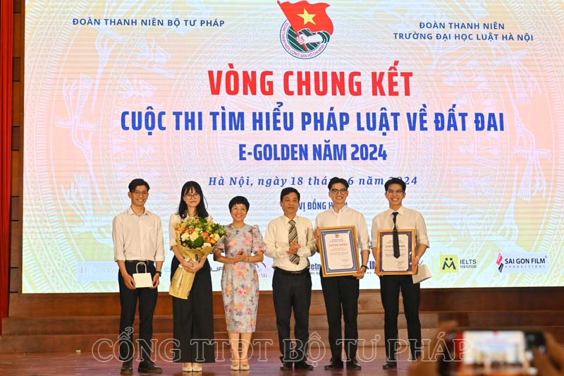 Tối ngày 18/6, Đoàn Thanh niên Bộ Tư pháp chủ trì, phối hợp với Đoàn Thanh niên Trường Đại học Luật Hà Nội tổ chức Vòng Chung kết “Cuộc thi tìm hiểu pháp luật Đất đai E-Golden năm 2024”. Tham dự cuộc thi có Thứ trưởng Bộ Tư pháp Nguyễn Thanh Tịnh; Đồng chí Bùi Hoàng Tùng - Ủy viên BCH Đảng bộ khối, Ủy viên BTV Trung ương Đoàn, Bí thư Đoàn khối; TS. Chu Mạnh Hùng – Bí thư Đảng uỷ, Chủ tịch Hội đồng Trường Đại học Luật Hà Nội.