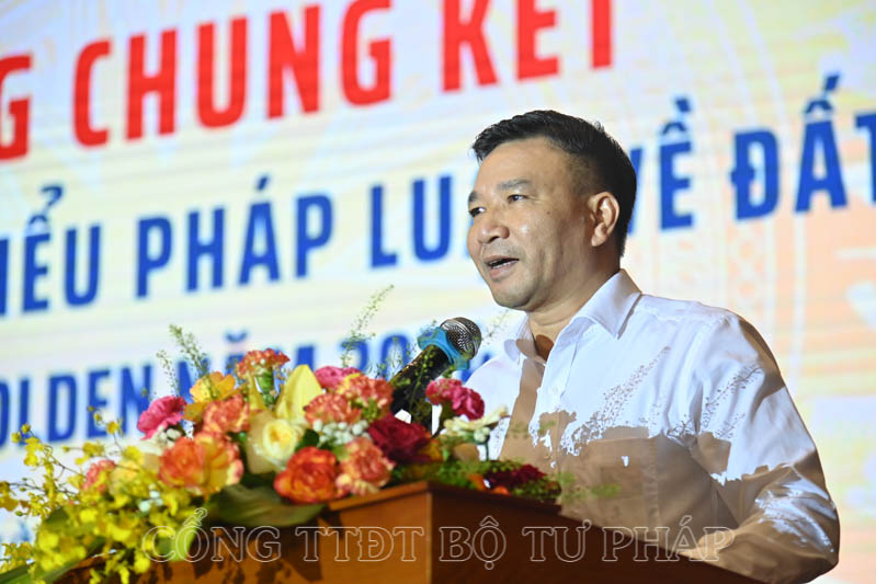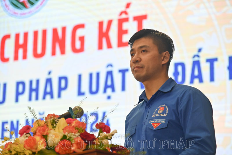 Phát biểu khai mạc Vòng Chung kết, đồng chí Trịnh Xuân Tùng – UVBCH Đoàn Khối, Bí thư Đoàn Thanh niên Bộ Tư pháp, Trưởng Ban Chỉ đạo Cuộc thi nêu rõ, cách đây hơn một tháng (ngày 07/5/2024), Lễ phát động Cuộc thi tìm hiểu pháp luật về đất đai E - Golden năm 2024 đã diễn ra thành công. Cuộc thi do Đoàn Thanh niên Bộ Tư pháp chủ trì với đội ngũ nòng cốt là Chi đoàn Cục Phổ biến, giáo dục pháp luật, phối hợp với Đoàn Thanh niên Trường Đại học Luật Hà Nội tổ chức, là sân chơi trí tuệ danh cho tất cả các sinh viên luật đang theo học tại các trường Đại học trên địa bàn TP Hà Nội. Với mong muốn phổ biến sâu rộng các kiến thức pháp lý mới về đất đai, nội dung thi tập trung vào các chính sách, quy định của Luật Đất đai năm 2024 – đạo luật được Quốc hội khóa XV thông qua, nhằm phát huy vai trò xung kích, sáng tạo của Đoàn Thanh niên trong việc thực hiện nhiệm vụ chuyên môn của Bộ, ngành Tư pháp, góp phần đẩy mạnh công tác phổ biến, giáo dục pháp luật nói chung, công tác PBGDPL về đất đai nói riêng, tạo sự lan toả, hưởng ứng mạnh mẽ của người dân, doanh nghiệp, nhất là đội ngũ sinh viên trong tổ chức thi hành Luật Đất đai năm 2024, góp phần đổi mới, nâng cao chất lượng, hiệu quả công tác PBGDPL trong nhà trường.
