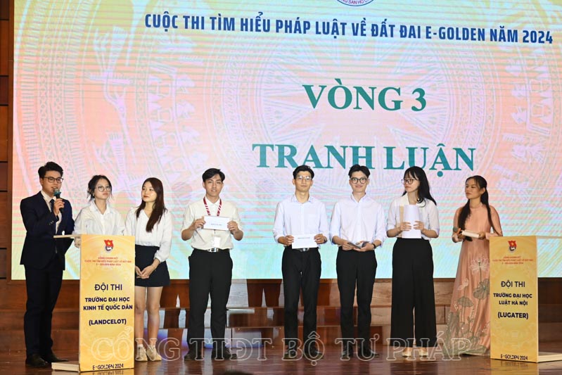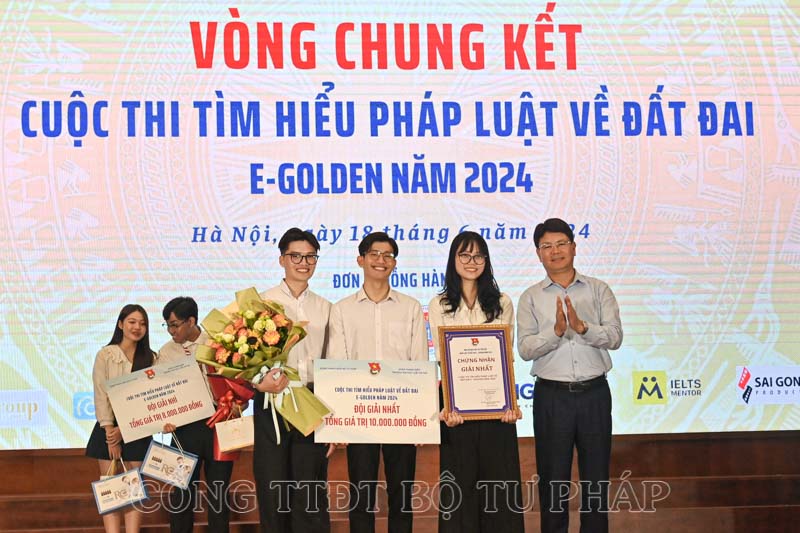 Sau nhiều giờ thi đấu, Đội thi “LUGATER” đến từ Trường Đại học Luật Hà Nội đã giành giải Nhất Cuộc thi tìm hiểu pháp luật Đất đai E-GOLDEN năm 2024; Đội thi “LANDCELOT” đến từ Trường Đại học Kinh tế Quốc dân giành giải Nhì và hai đội thi: “G DOUBLE H” đến từ Trường Đại học Luật - Đại học Quốc gia Hà Nội, “HÀNH TRANG NGHỀ LUẬT” đến từ Trường Đại học Thuỷ lợi giành giải Ba.