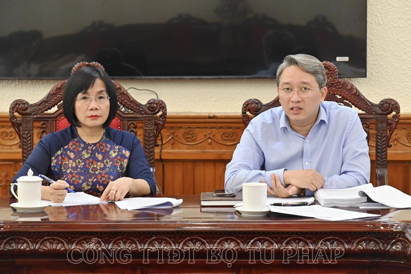 Bộ trưởng Bộ Tư pháp Nguyễn Hải Ninh (bên phải) phát biểu kết luận cuộc họp.