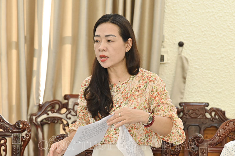 Phó Cục trưởng Cục Kiểm tra văn bản quy phạm pháp luật Nguyễn Thị Thu Hòe báo cáo tại cuộc họp.