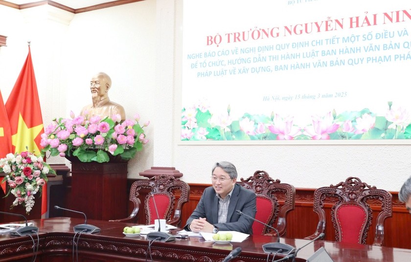 Ngày 15/3, Bộ trưởng Bộ Tư pháp Nguyễn Hải Ninh nghe báo cáo về Nghị định quy định chi tiết một số điều và biện pháp để tổ chức, hướng dẫn thi hành Luật Ban hành VBQPPL về xây dựng, ban hành VBQPPL.