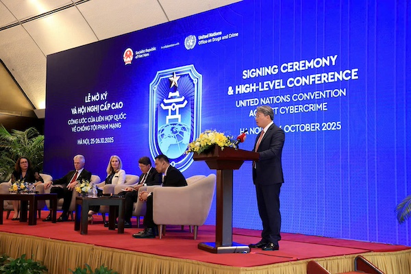 Trong bài phát biểu của mình, Bộ trưởng Nguyễn Hải Ninh khẳng định: Sự kiện Lễ mở ký Công ước Liên hợp quốc về chống tội phạm mạng diễn ra hôm nay tại Hà Nội không chỉ là một cột mốc quan trọng trong xây dựng thể chế pháp lý quốc tế về an ninh mạng, mà còn khẳng định vai trò chủ động, trách nhiệm của các quốc gia trong việc thiết lập một khuôn khổ hợp tác toàn cầu để đối phó với tội phạm mạng. Trên tinh thần đó, Việt Nam sẵn sàng hợp tác toàn diện với các quốc gia thành viên, tổ chức quốc tế và đối tác tư nhân, nhằm xây dựng một không gian mạng an toàn, lành mạnh, thúc đẩy phát triển bền vững và bảo vệ các giá trị nhân văn toàn cầu.