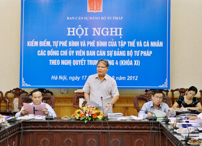 Thực hiện Nghị quyết Trung ương 4 (khóa XI), sáng 17/9, Bộ Tư pháp đã tổ chức Hội nghị kiểm điểm, phê bình và tự phê bình của tập thể Ban Cán sự Đảng và cá nhân các đồng chí Ủy viên. Nội dung kiểm điểm bám sát vào ba vấn đề cấp bách mà Nghị quyết Trung ương 4 (khóa XI) đã nêu ra. Đồng chí Nguyễn Văn Quyền, Phó Chánh Văn phòng Trung ương Đảng đã tới dự Hội nghị.