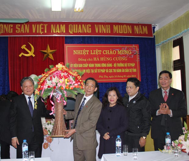 Trong 2 ngày 13-14/01, Đoàn công tác của Bộ Tư pháp do Bộ trưởng Hà Hùng Cường dẫn đầu thăm và chúc Tết tại tỉnh Tuyên Quang, Phú Thọ, Vĩnh Phúc. Tham gia Đoàn còn có Thứ trưởng Nguyễn Thúy Hiền, Thứ trưởng Lê Hồng Sơn, Phó Tổng cục trưởng Tổng cục THADS Hoàng Sỹ Thành, Phó Vụ trưởng Vụ Tổ chức cán bộ Đinh Văn Lộc, Phó Vụ trưởng Vụ Kế hoạch tài chính Nguyễn Tiến Hưng, Phó Chánh văn phòng - Thư ký Bộ trưởng Đỗ Đức Hiển, Trưởng phòng Lễ tân - Quan hệ công chúng Lê Thu Anh.