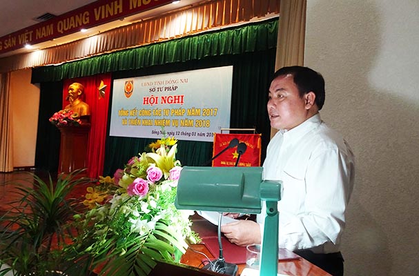 Vừa qua, Sở Tư pháp tỉnh Đồng Nai tổ chức Hội nghị tổng kết công tác tư pháp năm 2017 và triển khai nhiệm vụ năm 2018, đồng chí Viên Hồng Tiến – Giám đốc Sở Tư pháp chủ trì Hội nghị. Tham dự Hội nghị có đồng chí Nguyễn Thanh Bình - Cục trưởng Cục Công tác phía Nam (Bộ Tư pháp), đồng chí Đinh Quốc Thái - Phó Bí thư Tỉnh ủy - Chủ tịch UBND tỉnh và các đồng chí đại diện Thường trực HĐND tỉnh, Ủy ban MTTQ tỉnh, các Sở, ban, ngành và địa phương trong tỉnh.