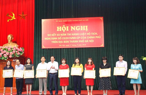 Tại Hội nghị, Thứ trưởng Nguyễn Khánh Ngọc và Phó Chủ tịch UBND TP Hà Nội Lê Hồng Sơn đã trao tặng Bằng khen của Chủ tịch UBND TP Hà Nội cho 10 tập thể và 9 cá nhân đã có thành tích trong triển khai thi hành Luật Hộ tịch trên địa bàn thành phố.
