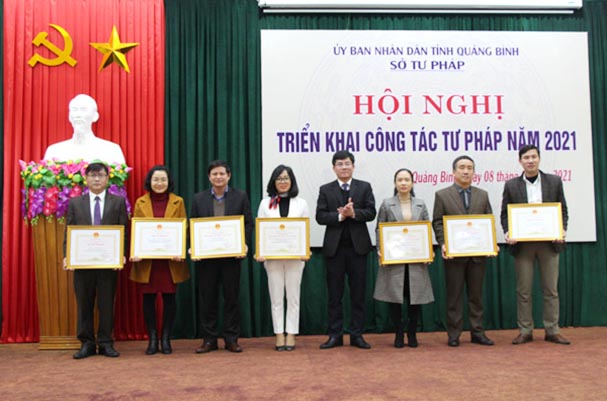 Dịp này, Sở Tư pháp có 01 tập thể vinh dự được Thủ tướng Chính phủ tặng Bằng khen vì có thành tích trong công tác, góp phần vào sự nghiệp xây dựng và bảo vệ Tổ quốc; tập thể Sở Tư pháp được Bộ Tư pháp tặng cờ thi đua ngành Tư pháp vì đã có thành tích xuất sắc trong phong trào thi đua theo Chuyên đề “Thi đua lập thành tích xuất sắc chào mừng kỷ niệm 75 năm ngày truyền thống ngành Tư pháp và Đại hội thi đua yêu nước ngành Tư pháp lần thứ V; 14 cá nhân được trao tặng kỷ niệm chương “Vì sự nghiệp Tư pháp”; 01 tập thể, 03 cá nhân có thành tích trong các phong trào thi đua theo chuyên đề được Bộ Tư pháp tặng bằng khen. Chủ tịch UBND tỉnh cũng đã tặng danh hiệu lao động xuất sắc cho 03 tập thể và tặng bằng khen cho 01 tập thể và 04 cá nhân; 14 tập thể có thành tích xuất sắc trong công tác Tư pháp năm 2020 cũng được Giám đốc Sở Tư pháp tặng giấy khen.