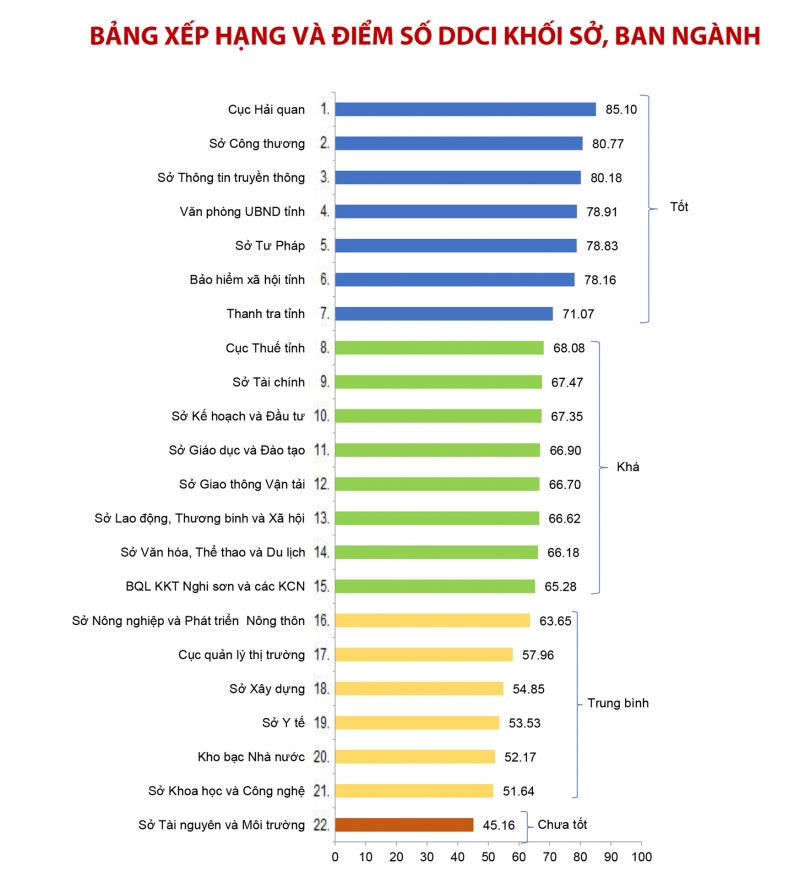 Theo kết quả công bố Bộ chỉ số DDCI Thanh Hóa năm 2022, khối các đơn vị sở, ngành có 7 đơn vị xếp hạng tốt gồm: Cục Hải quan tỉnh, Sở Công Thương, Sở Thông tin và Truyền thông, Văn phòng UBND tỉnh, Thanh tra tỉnh. Trong đó, ghi nhận Cục Hải quan là đơn vị dẫn đầu, với 85,10 điểm. Vị trí thứ 2 và thứ 3 thuộc về Sở Công thương và Sở Thông tin và Truyền thông, với lần lượt 80,77 và 80,18 điểm. Tiếp theo là 3 đơn vị có điểm số đều ở mức trên 78 điểm, bao gồm Văn phòng UBND tỉnh, Sở Tư pháp và Bảo hiểm xã hội tỉnh. Thanh tra tỉnh được 71,07 điểm, xếp ở vị trí số 7, và đây cũng là đơn vị cuối cùng được xếp vào nhóm “tốt”. Tiếp theo là 8 đơn vị thuộc nhóm “Khá”, với điểm số dao động ở mức từ 68,08 điểm xuống 65,28 điểm, gồm: Cục Thuế tỉnh, Sở Tài chính, Sở Kế hoạch và Đầu tư, Sở Giáo dục và Đào tạo, Sở Giao thông Vận tải, Sở Lao động - Thương binh và Xã hội, Sở Văn hóa - Thể thao và Du lịch, Ban Quản lý Khu kinh tế Nghi Sơn và các Khu công nghiệp. Tiếp theo là 6 đơn vị thuộc nhóm “Trung bình” với điểm số dao động từ 63,65 điểm xuống 51,64 điểm, gồm: Sở Nông nghiệp và Phát triển nông thôn, Cục Quản lý thị trường, Sở Xây dựng, Sở Y tế, Kho bạc Nhà nước và Sở Khoa học và Công nghệ.