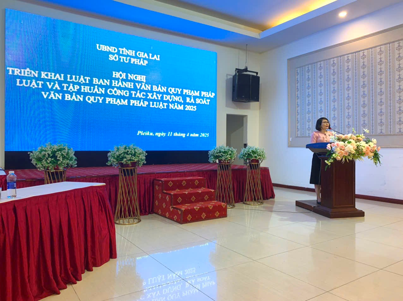 Thực hiện Kế hoạch số 3137/KH-UBND ngày 31/12/2024 của Ủy ban nhân dân tỉnh triển khai công tác pháp chế và công tác xây dựng, kiểm tra, rà soát văn bản quy phạm pháp luật năm 2025 trên địa bàn tỉnh Gia Lai, nhằm phổ biến, thông tin kịp thời các quy định mới của Luật Ban hành văn bản quy phạm pháp luật năm 2025, Nghị định số 78/2025/NĐ-CP ngày 01/4/2025 của Chính phủ quy định chi tiết một số điều và biện pháp để tổ chức hướng dẫn thi hành Luật Ban hành văn bản quy phạm pháp luật, ngày 11/4/2025, Sở Tư pháp đã tổ chức Hội nghị triển khai Luật Ban hành văn bản quy phạm pháp luật và tập huấn công tác xây dựng, rà soát văn bản quy phạm pháp luật năm 2025 cho gần 50 người là đại diện của Văn phòng Ủy ban nhân dân tỉnh, người làm công tác pháp chế, người làm công tác xây dựng, rà soát văn bản quy phạm pháp luật tại sở, ban, ngành thuộc tỉnh.