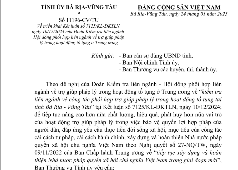 Ngày 24/01/2025 Tỉnh ủy Bà Rịa – Vũng Tàu có Công văn số 11196-CV/TU về việc triển khai Kết luận số 7125/KL-ĐKTLN ngày 10/12/2024 của Đoàn kiểm tra liên ngành – Hội đồng phối hợp liên ngành về trợ giúp pháp lý trong hoạt động tố tụng ở Trung ương do đồng chí Nguyễn Văn Tiến, Phó Chánh án Tòa án nhân dân tối cao làm trưởng đoàn.