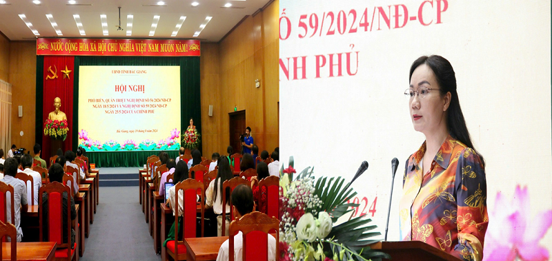 Ngày 19/8/2024, UBND tỉnh Bắc Giang tổ chức Hội nghị phổ biến, quán triệt Nghị định số 56/2024/NĐ-CP ngày 18/5/2024 và Nghị định số 59/2024/NĐ-CP ngày 25/5/2024 của Chính phủ. Tham gia Hội nghị có trên 100 đại biểu là đại diện lãnh đạo các sở, ngành, cơ quan thuộc UBND tỉnh; đội ngũ công chức tham mưu công tác pháp chế, tham mưu nhiệm vụ công tác văn bản tại các cơ quan thuộc UBND tỉnh, Công an tỉnh; cộng tác viên kiểm tra, rà soát, hệ thống hóa văn bản QPPL tỉnh. Được sự ủy quyền của Phó Chủ tịch UBND tỉnh, đồng chí Đỗ Thị Việt Hà - Giám đốc Sở Tư pháp dự và chủ trì hội nghị.