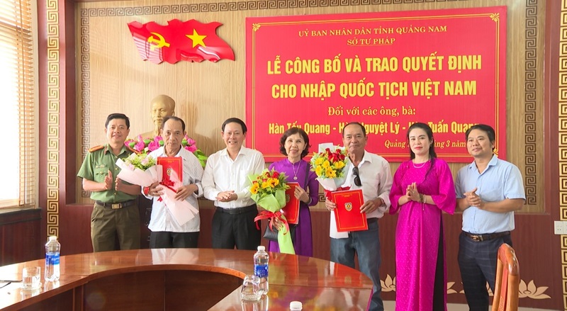 Ngày 05/02/2024, Chủ tịch nước Cộng hòa xã hội chủ nghĩa Việt Nam đã có Quyết định số 127/QĐ-CTN về việc cho nhập quốc tịch Việt Nam đối với 03 công dân: ông Hàn Tấu Quang, bà Hàn Nguyệt Lý, ông Hàn Tuấn Quang đều cư trú tại phường Phước Hòa, thành phố Tam Kỳ, tỉnh Quảng Nam. Thực hiện chỉ đạo của UBND tỉnh Quảng Nam tại Công văn số 1514/UBND-NCKS ngày 06/3/2024, sáng ngày 14/3/2024, Sở Tư pháp đã tổ chức Lễ Công bố và trao quyết định của Chủ tịch nước cho nhập quốc tịch Việt Nam đối với 03 công dân nêu trên.