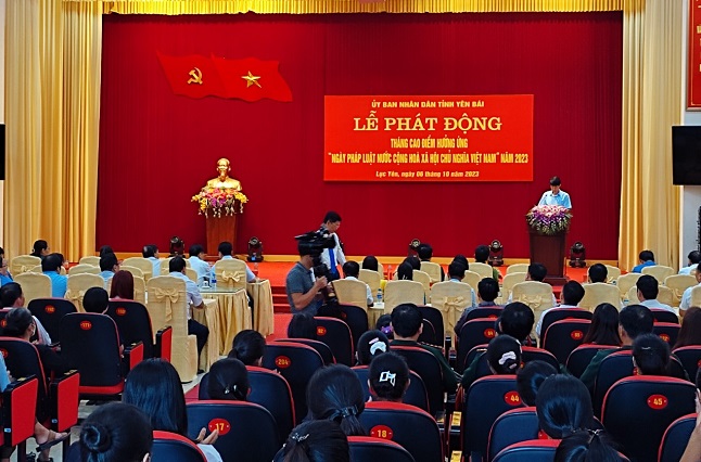 Sáng ngày 6/10, tại Hội trường trung tâm huyện Lục Yên, UBND tỉnh Yên Bái tổ chức Lễ Phát động Tháng cao điểm hưởng ứng Ngày pháp luật nước Cộng hòa xã hội Chủ nghĩa (CHNXCN) Việt Nam năm 2023. Dự lễ phát động có đồng chí Nguyễn Huy Cường- Giám đốc Sở Tư pháp, Phó Chủ tịch Thường trực Hội đồng phối hợp phổ biến, giáo dục pháp luật (PBGDPL) tỉnh; đại diện lãnh đạo các sở, ban, ngành là thành viên Hội đồng phối hợp PBGDPL tỉnh; các đồng chí lãnh đạo Huyện ủy, HĐND,UBND, MTTQ huyện Lục Yên; lãnh đạo UBND các huyện: Văn Yên, Yên Bình; lực lượng công an, quân đội, đoàn viên thanh niên, hội viên hội phụ nữ, học sinh và nhân dân huyện Lục Yên.