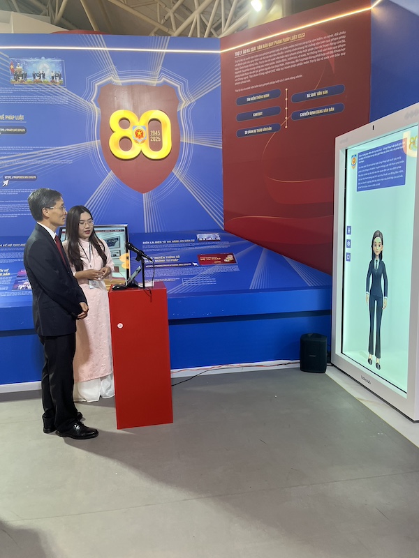 Chủ tịch Hội Luật gia Việt Nam Nguyễn Khánh Ngọc trải nghiệm AI Pháp luật tại không gian trưng bày của Bộ Tư pháp.